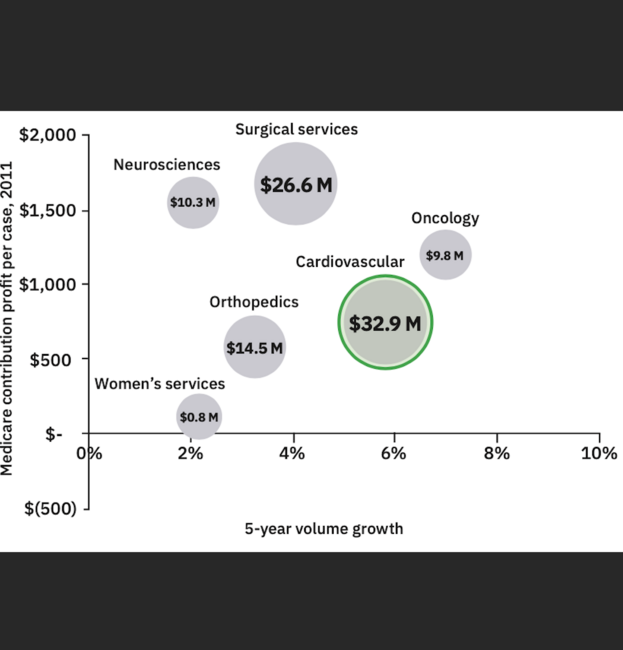 Hospitals and cardiologists need to understand that physician compensation is not tied to the fact that cardiologists are associated with a highly recognized disease state, dealing with life and death decisions daily. The issue is that the cardiology service line is the highest revenue-generating service line in the majority of hospitals. The lost opportunity is not aligning physician and hospital goals, and incentivizing hospitals and physicians to work together to enhance the contribution margin from the cardiovascular service line. Reducing complications, reducing length of stay, and managing risks are the means to increasing contribution margins, and cardiologists need to be part of the solution. The bubble chart in Figure 1 shows how hospitals typically prioritize service lines. These data, from the Advisory Board’s State of Our Service Lines analysis2, show that in 2011 to 2012, cardiovascular service lines were the largest contributor to hospital profit and the second-fastest growing service line. As providers, we must understand this is the main driver of why we have been compensated much higher than other subspecialties for more than the last decade and we must ask ourselves, is this simply going to continue, or do we need to take action?