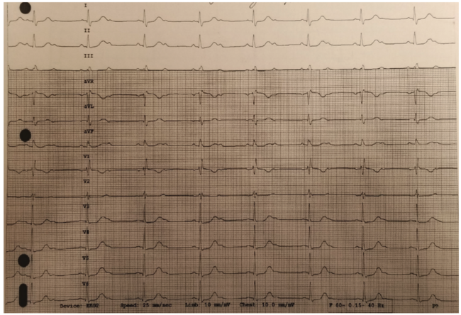 A 73-year-old female with no significant cardiac history presented for an elective right knee replacement surgery. After the right knee replacement surgery and while in the recovery room, she was noted to be bradycardic and telemetry showed a new 2:1 atrioventricular (AV) block. The patient had significant right knee pain around that time and she received a dose of oxycodone. She denied having any symptoms with new bradycardia and 2:1 AV block. She was not on any AV nodal blocking agents. She continued to remain bradycardic with her heart rate in 40s and 2:1 AV block, and was completely asymptomatic. Initially, her new 2:1 AV nodal block was thought to be pain induced, vagal in etiology. She was discharged home on a 30-day event monitor. A transthoracic echocardiogram was normal.