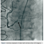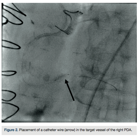 Complications during percutaneous coronary intervention (PCI) are rather infrequent, with less than 1% of all cases requiring emergency cardiothoracic intervention.2 Management of entrapped devices during PCI can be frustrating and anxiety provoking. Due to their thrombogenicity, lethal consequences such as myocardial infarction can occur with entrapped devices and thus ischemic, hemodynamically unstable patients often require immediate percutaneous retrieval or even sternotomy and coronary bypass.1 Owing to the scarcity of the complication, however, available literature regarding surgical or medical management for the hemodynamically stable patient is limited. As a result, no formal guidelines exist. While most experts favor removal of any foreign body from the coronary circulation, existing data suggests that catheter remnants or stents do not necessarily mandate removal.3,4 In our case, the patient remained hemodynamically stable with improved flow to the distal PDA and thus, surgical intervention was deferred.