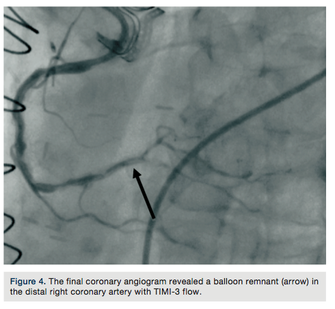 need for emergency surgical therapy, but management of the hemodynamically stable patient often remains in question. Due to the scarcity of this complication, available literature is quite limited. Here we present a case where a ruptured angioplasty balloon was entrapped in the right coronary artery and was retained in situ.