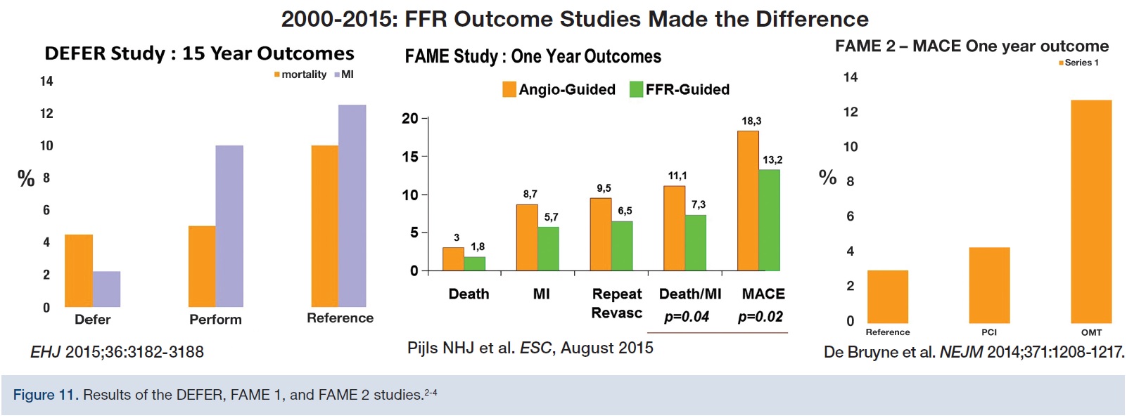 The validation and extensive single-center clinical applications of FFR led to multicenter trials over the next 15 years. The most famous studies were the DEFER trial, and the FAME 1 and FAME 2 trials.2-4 The DEFER trial asked whether it is safe to defer lesions by FFR; the answer was “yes”. The FAME 1 trial asked whether it was better to guide stenting based on ischemia and FFR rather than angiography alone, and the answer, again, was “yes”. Lastly, the FAME 2 trial, published in 2014 in the New England Journal of Medicine4, asked whether it is better for patients who are ischemic with positive FFRs to be treated with revascularization rather than optimal medical therapy alone, and the answer was, again, yes for percutaneous coronary intervention (Figure 11).