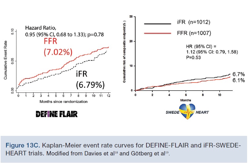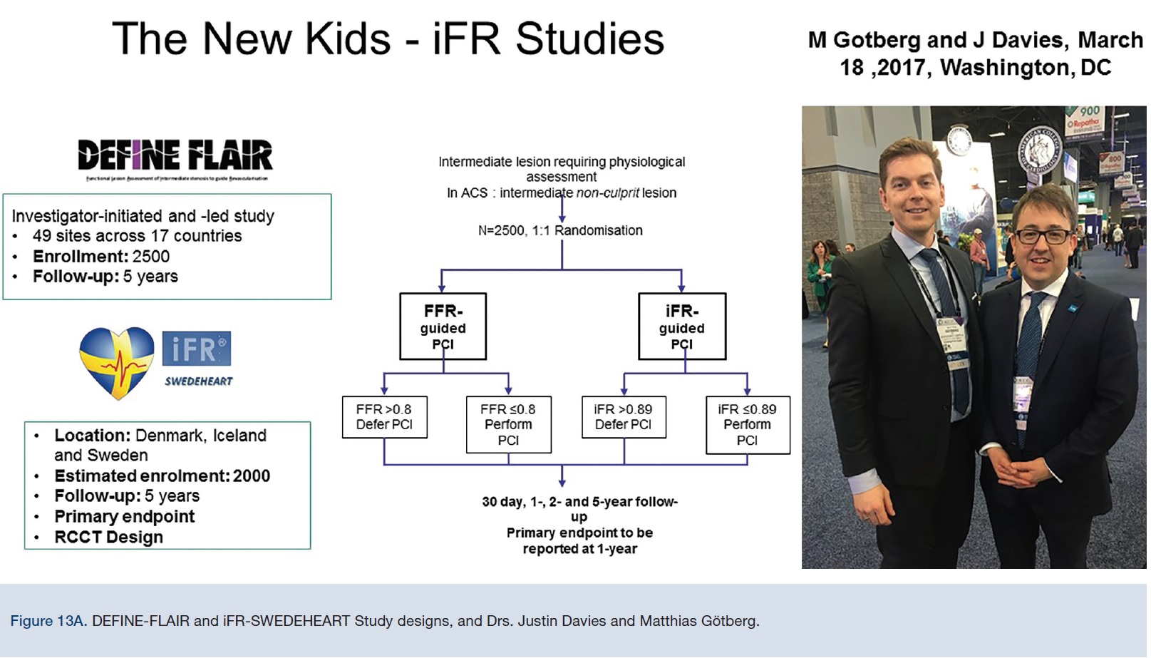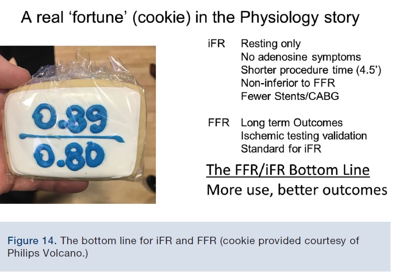 3In 2012, a number of my colleagues, leaders in the field, and I were gathered at the commemoration of the FAME studies at TCT. The question was asked, “Can a resting Pd/Pa or iFR really work?” At that time, the answer was universally, “Not likely.” (Actual comments from my colleagues are paraphrased for the photograph, Figure 13A). Despite this dark view, iFR studies continued and randomized comparisons to FFR were undertaken. On March 18, 2017, the iFR randomized multicenter trials — the new kids on the block — were presented by Matthias Götberg and Justin Davies at the late-breaking trials session at the ACC Scientific Sessions (Figure 13B). DEFINE-FLAIR is an international, multicenter trial, and the SWEDEHEART study took place in Denmark, Iceland, and Sweden, randomizing iFR and FFR to treat or no-treat decision points.18,19 These studies, summarized in the May 2017 Clinical Editor’s page in Cath Lab Digest, demonstrated that iFR was non-inferior to FFR in both the DEFINE-FLAIR and SWEDEHEART studies, with only minor differences between them (Figure 13C). In summary, because these studies used resting measurements only, compared to FFR, there were no adenosine-related symptoms, since no adenosine is given. iFR had shorter procedure times by 4.5 minutes, again, because no adenosine was given. The main results demonstrated non-inferior outcomes compared to FFR in low-risk patients. Lastly, because iFR measurements were more frequently nonischemic values, there were fewer stents and CABGs performed in the iFR vs the FFR group. However, we should recall that FFR had and still has better long-term outcomes, better ischemic testing validation, and that the standard against which iFR was compared is FFR. The bottom line for the iFR/FFR debate is that more use of either technique would produce better outcomes (Figure 14).