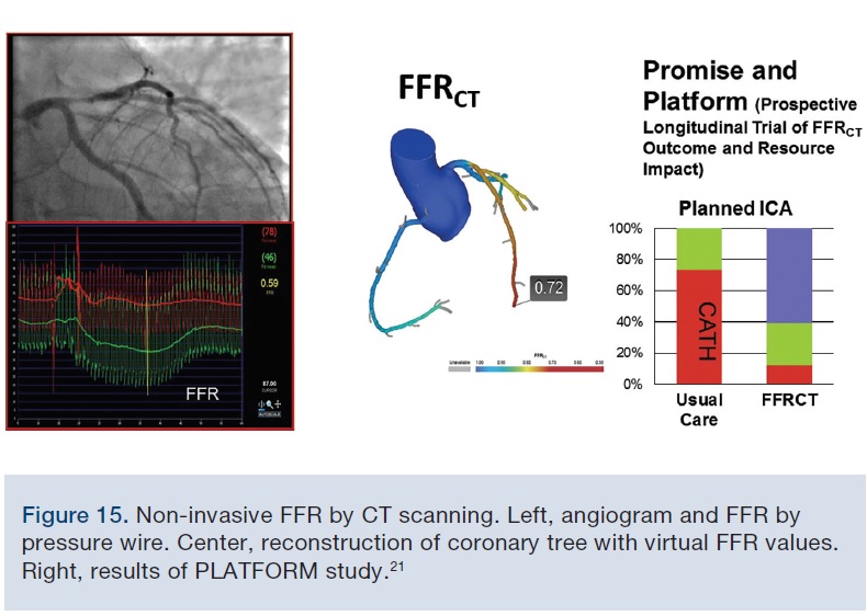 The future of coronary physiology over the next decade is the validation and application of noninvasive imaging-based FFR such as FFRCT (Figure 15). Using 3D reconstruction of the arterial imaging scan and applying computational fluid dynamics, we can generate a virtual FFR. FFRCT has an 80% correspondence to invasive FFR, and data from the PROMISE and PLATFORM studies20,21 showed the ability to reduce procedures by excluding normal angiograms. FFRCT will likely lead the way for further future applications, surpassing our routine stress test approach and focusing the direction of those patients coming to cath lab for PCI rather than merely a diagnostic study. My personal bottom line for the 30-year overnight success story is that this is the best time ever to be involved with coronary physiology and interventional cardiology.