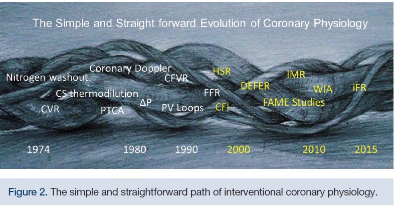 The evolution of interventional coronary physiology (like PCI) is not simple and straightforward (Figure 2). The twists and turns, and the opposing interactions between the different areas, scientists, and regions of the world while developing techniques to measure coronary blood flow and pressure are complex. Beginning in the 1930’s up to about 1970, there were very few techniques for measuring human coronary blood flow. These early methods, such as nitrogen washout, coronary sinus thermodilution and microspheres were difficult, imprecise, and often impractical. In 1974, Dr. K. Lance Gould, undoubtedly a driving spirit of investigation into human coronary physiology, demonstrated in several elegant animal experiments that coronary flow reserve, or hyperemic maximal to basal flow ratio, could be related to stenosis severity, and perhaps overcome the limitations and ambiguity of the coronary angiogram for detection of ischemia.1