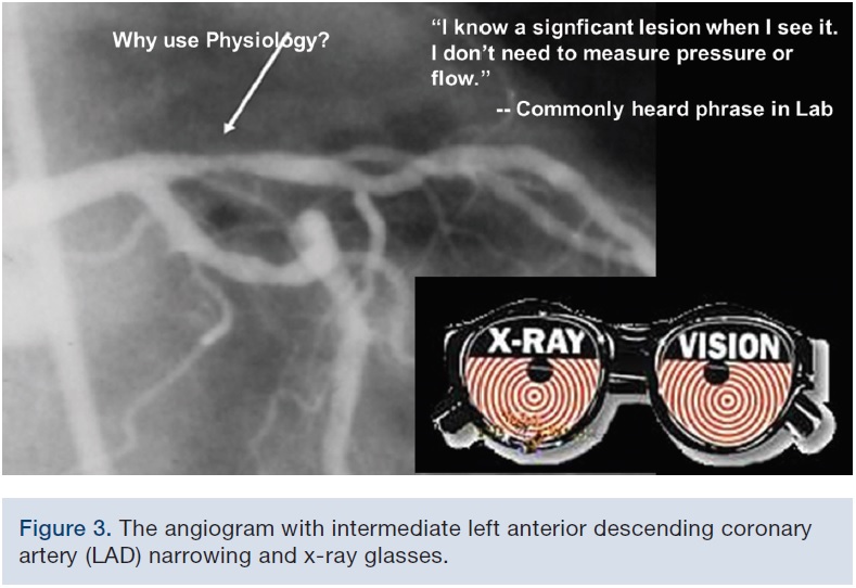 In viewing an angiogram, “I know what a significant lesion is when I see it and I don’t need to measure pressure of flow”, was (and is) commonly heard from many interventionalists. “Of course, (wearing x-ray glasses) I trust my eyes and I know that whatever I see must be true” (Figure 3). However, the angiographic assessment of lumen severity has proven to be a false friend. In 1974, Dr. K. Lance Gould was the first to say this, noting, “The motivation behind clinical coronary physiology is… [driven] by angiographic ambiguity… which intensified the [need for the] noninvasive testing world.” He further stated, in the recent historical review by Johnson et al5 (Figure 4), that “we face today the same quandary as the clinicians faced at the beginning of invasive coronary angiography in 1979. Namely, how should we determine which lesions or lesion to revascularize, and which can be deferred for medical therapy alone”.