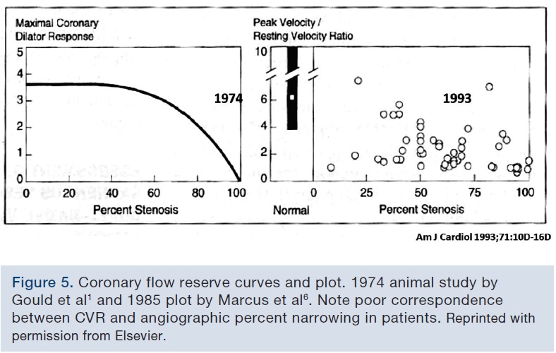Gould et al’s 1974 study1 was probably the most impactful coronary physiologic study of the modern era. Gould et al measured coronary flow reserve (CFR) in experimental dogs and plotted it against the percent diameter stenosis induced by a micromanometer occluder. CFR began to decline when stenoses were >60% narrowing and resting flow decreased when stenoses were >90% narrowed. Hence, it was thought that coronary physiology could predict anatomy and vice versa. However, in 1993, Marcus et al showed us this was not true in human patients. Compare CFR vs percent stenosis in the 1974 curve of Gould et al to that of Marcus et al in 19886 (Figure 5). In human patients, unlike in the experimental dogs, CFR was poorly related to the angiographic percentage narrowing, because of two factors: 1) the inability of the angiogram to precisely determine the stenosis area and length, and 2) the fact that some patients had microvascular disease and an impaired coronary flow reserve, even with normal coronary arteries.