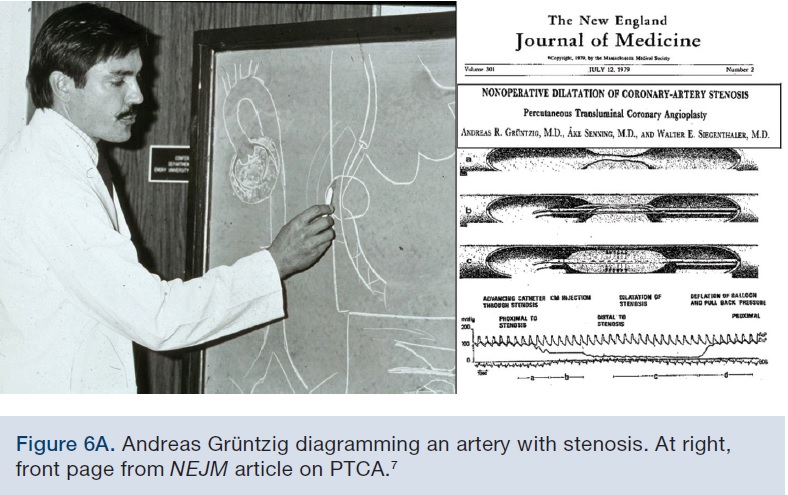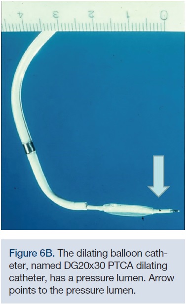 This conundrum caused the field of human coronary physiology to stall, until on July 12, 1979, Dr. Andreas Grüntzig, the first interventional coronary physiologist, reported the first “nonoperative dilatation of the coronary artery stenosis”; that is, percutaneous coronary balloon angioplasty, in the New England Journal of Medicine7 (Figure 6A). This paper showed the method and results of the dilating Grüntzig catheter (DG20x30) inflating in a stenosis. The measurement of the pressure gradient before and after the balloon inflation and deflation was used to guide the procedure, and overcome the very poor angiographic image quality at that time. Pressure measurements during percutaneous transluminal coronary angioplasty (PTCA) were questioned, because of the technical difficulty of measuring pressure through a large 4.5 French (F) catheter with a small, fluid-filled pressure lumen (Figure 6B). Over the next few years, coronary angiography improved dramatically and Dr. Jeff Hartzler, one of the world’s leading interventionalists at that time, did not believe we needed pressure to do angioplasty. The use of pressure measurements returned with a vengeance a decade later.