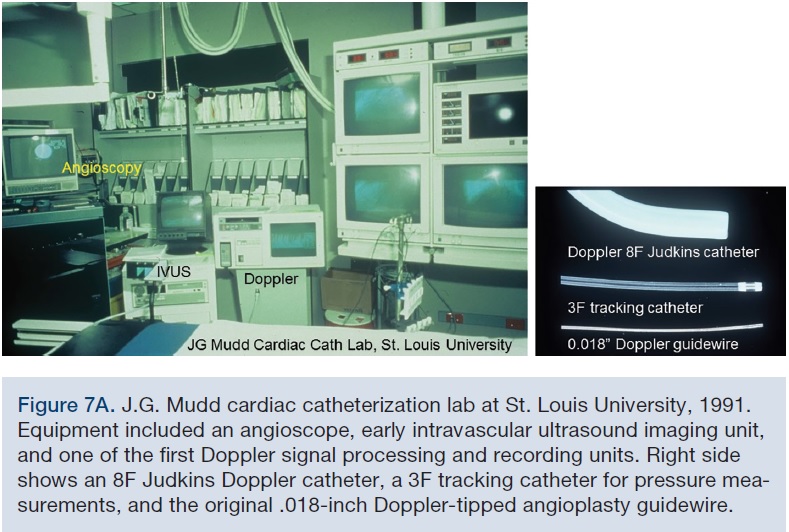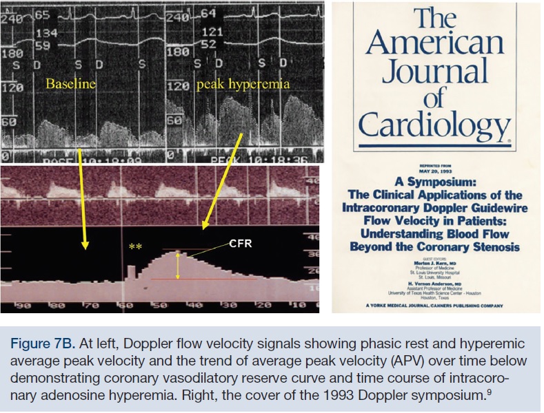 In 1990, I equipped a Judkins 8F catheter with a Doppler crystal at the tip8 (Figure 7A). I thought that measuring left main coronary blood flow velocity with this catheter would be revolutionary for pharmacologic and other interventional studies in the human coronary circulation. It was fortuitous that the same year, Dr. Meno Nassi, CEO of Cardiometrics, Inc., asked if I thought a Doppler-tipped angioplasty guidewire would have any value in the cath lab and PTCA procedures. After passing the flow wire through my Judkins Doppler catheter and realizing I could measure flow everywhere in the coronary tree, I thought, I’ve just obsoleted myself. I said to Meno, “I think so, but let me just test it out a few more times.” I was thrilled. Measuring intracoronary flow velocity opened new doors. Within the next two years, we produced a symposium in the American Journal of Cardiology, entitled “The clinical application of intracoronary Doppler flow velocity in patients: understanding flow beyond the coronary stenosis” (Kern and Anderson on May 20, 1993).9 This symposium detailed the characteristics of coronary flow velocity and its numerous applications (Figure 7B). Coronary flow reserve could now be acquired and measured, in any vessel, in any setting, in any patient in the cath lab.