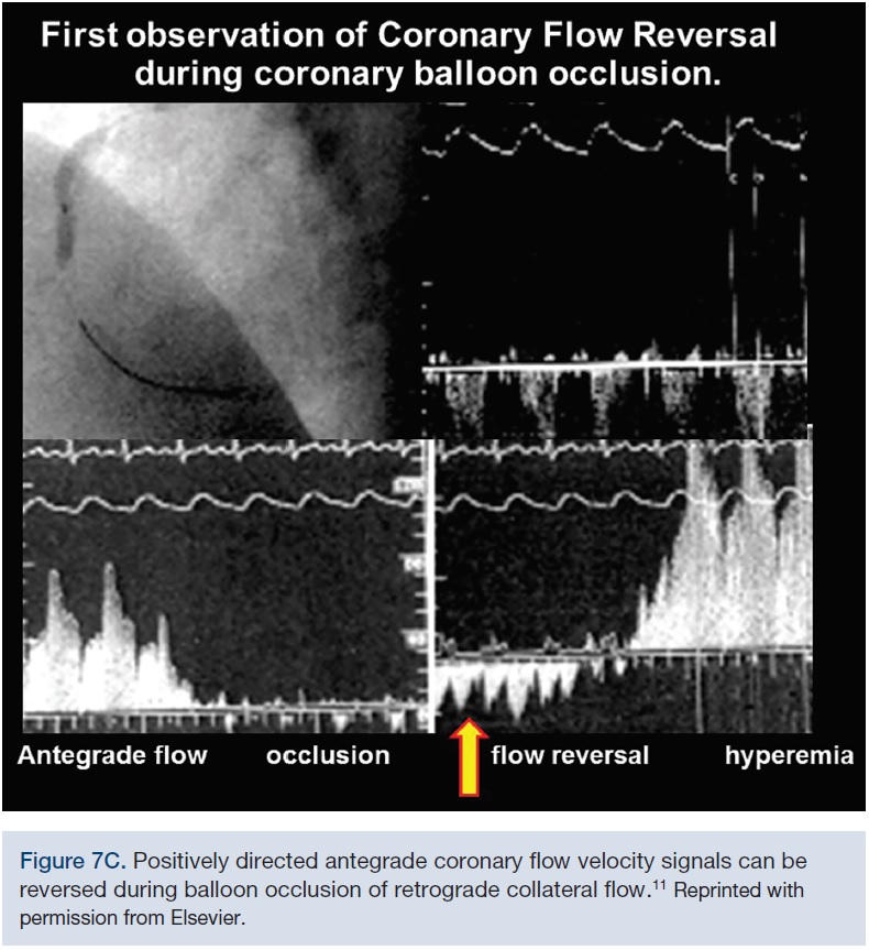 In one of our most unique observations in 1993, during PTCA with a Doppler wire distal to the balloon occlusion, the normal antegrade flow, seen as a positive Doppler signal, suddenly became reversed in some patients.11 While seeing this phenomenon for the first time (Figure 7C), a visiting faculty candidate, Dr. Thomas Donahue, now at Yale, asked me, “Why is the signal reversed?”