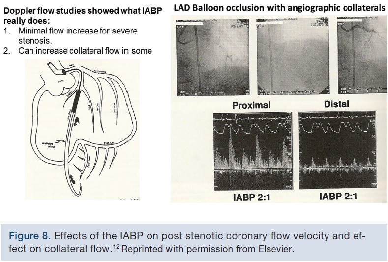 Regarding the effects of an intra-aortic balloon pump (IABP), we found that Doppler flow increased flow across mild and moderate stenoses, but had minimal effect to increase flow across severe stenoses, and that in some patients, collateral flow could be increased by intra-aortic balloon pumping; again, a remarkable method to verify proposed and speculative mechanisms of IABP action12 (Figure 8).