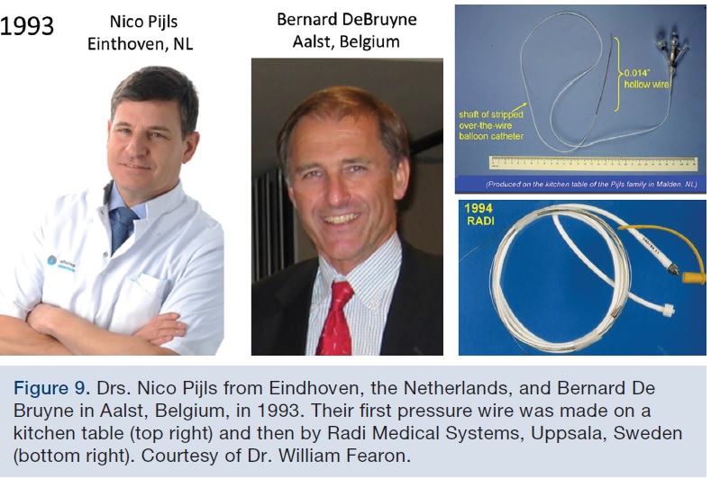 At the same time in 1993, while we were working on studies of coronary Doppler, Nico Pijls from Eindhoven, the Netherlands, and Bernard De Bruyne in Aalst, Belgium, were the first to begin using a .014-inch hollow sensor angioplasty guide wire to measure pressure across a stenosis (Figure 9). By 1994, Radi Medical Systems, out of Uppsala, Sweden, had produced a first solid state pressure wire. With the invention of these devices, the evolution of the pressure-only flow reserve theory could be tested, which culminated in the derivation and application of the fractional flow reserve concept.15,16 Pijls and DeBruyne were the first to publish on the fractional flow reserve of the myocardium. FFR is the percent of stenotic flow to normal flow across a stenosis. The flow ratio is computed from the distal/aortic pressure measurements. One important aspect in the development of the FFR was the incorporation of venous pressure to account for collateral flow, making the validation successful in both the animal lab as well as in clinical outcome studies.