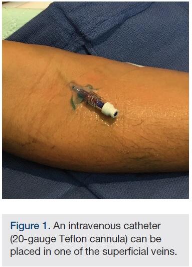 Upper extremity venous access is frequently obtained independently by nurses for a multitude of reasons necessitating intravenous therapy. For patients referred for a left and right heart catheterization, the pre-procedural nursing staff can place an intravenous catheter (20-gauge Teflon cannula) in one of the superficial veins in a sterile fashion before the patient is brought to the catheterization laboratory (Figure 1). Once in the cardiac catheterization laboratory, the venipuncture site can be re-prepped in a sterile fashion, anesthetized, and with an over-the-wire exchange of the Teflon cannula, a hydrophilic introducer can be introduced in the superficial vein using a micropuncture system (Figures 2A-C). Obviously, venous access can be obtained by the operator in the cardiac catheterization laboratory, although obtaining superficial venous access before the procedure significantly shortens the procedure duration and complexity.3