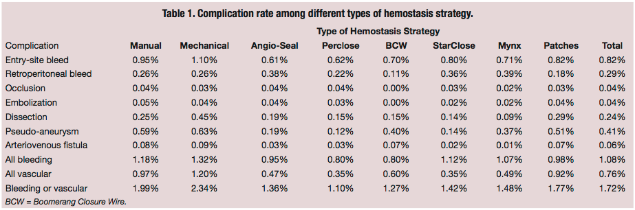 The hemostasis strategy comparison analyses for this study included only femoral access site subjects. Other access sites (including brachial, radial, and “other”) were added in multivariate analysis in order to compare complication rates for the different access sites.