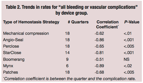 Trend analysis. Table 2 shows the trend analysis by quarter (beginning with the first quarter in which there were 10 or more PCIs using that hemostasis strategy) for “bleeding or vascular complication” rates over time, for each of the 8 hemostasis strategy groups.