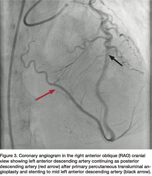The patient underwent successful primary angioplasty and stenting to the mid LAD. Post procedure selective coronary angiogram of left coronary artery showed thrombolysis in myocardial infarction III (TIMI-III) flow in the LAD which continued as the posterior descending artery (PDA) (Figure 3). Post procedure, the patient was stable and discharged after five days from the hospital.