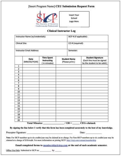 Note: Time spent “in the room” with the student and not providing instruction is not considered educational and is not eligible for CEUs. The program director must maintain documentation of the clinical instructor’s time spent providing student instruction. This should include date and time, as well as the instructor’s and student’s signatures. A sample clinical instructor log is available from SICP; however, all clinical instructor logs should be submitted to the program director, not to SICP or CCI. The program director of the invasive cardiovascular technology or electrophysiology educational program must register with SICP and submit the CEU credits quarterly or by semester, based on the educational schedule. The program director may apply and be approved for up to three years. However, the invasive cardiovascular technology or electrophysiology educational program must remain accredited.