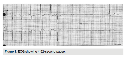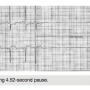 An 81-year-old woman with past history of paroxysmal atrial fibrillation and hypertension presented with progressive shortness of breath. She was admitted for acute exacerbation of congestive heart failure due to systolic dysfunction, requiring diuretic administration. She had several episodes of severe sinus bradycardia with asystole and several pauses of up to 4 seconds during hospitalization. There were also several runs of non-sustained ventricular tachycardia, immediately preceding the sinus bradycardia episodes. Her echocardiogram was suboptimal due to poor acoustics window, which showed a limited left ventricular (LV) function assessment.