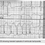 During cardiac rhythm monitoring, several episodes of severe sinus bradycardia occurred, with a few transient asystole and sinus pauses of up to 4 seconds (Figure 1). The patient also had several runs of non-sustained ventricular tachycardia (Figure 2), usually immediately preceded by the sinus bradycardia episodes. Management of ventricular tachyarrhythmias with beta-blockers was limited due to concomitant episodes of sinus bradycardia. It was decided to insert a permanent pacemaker,