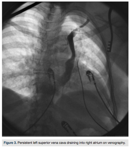 A persistent left superior vena cava is usually incidentally found during central venous cannulation, pacemaker insertion, ICD implantation, cardiopulmonary bypass, or autopsy. Therefore, in central line placement in patients with a left superior vena cava, it is prudent not to irritate the coronary sinus, as severe hypotension, arrhythmias, myocardial ischemia, and even cardiac arrest may develop. In general, patients with a persistent left superior vena cava are asymptomatic, especially in the absence of co-morbid congenital abnormalities such as atrial septal defect, ventricular septal defect, pulmonary stenosis, Tetralogy of Fallot, and anomalous pulmonary drainage.4