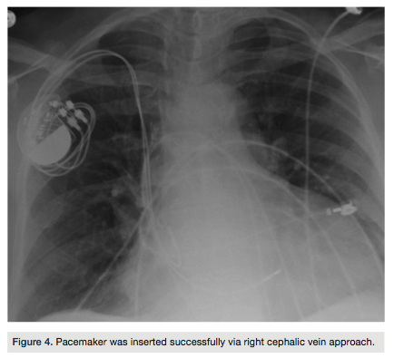 placed, an atrial lead could not be positioned superiorly in an optimal position via this approach. The left cephalic vein approach was abandoned and the pacemaker was successfully inserted via the right pectoral approach through the right cephalic vein (Figure 4).