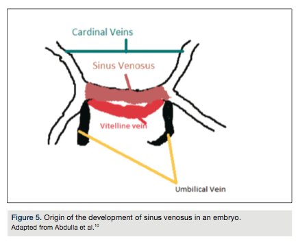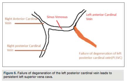 dorsally to the right atrium. In a fifth-week fetus, the common cardinal veins, the umbilical vein, and the vitelline vein drain into the sinus venosus (Figure 5). The common cardinal vein serves as the major venous drainage of the embryo, with the anterior cardinal vein carrying blood from the cephalic part of the embryo, while the posterior cardinal vein carries blood from the caudal part of the embryo. The vitelline vein connects with the yolk sac to the sinus venosus. Umbilical veins are the sources for carrying oxygenated blood from the placenta for the embryo.9 The distal part of the left cardinal vein then degenerates and the proximal portion connects to the right anterior cardinal vein, forming the superior vena cava. The left posterior cardinal vein degenerates with the formation of ligament of Marshall (Figure 6), a process completed around the eighth week of embryo life.10 The failure of the left posterior cardinal vein to degenerate results in a persistent left superior vena cava state, even in association with a left