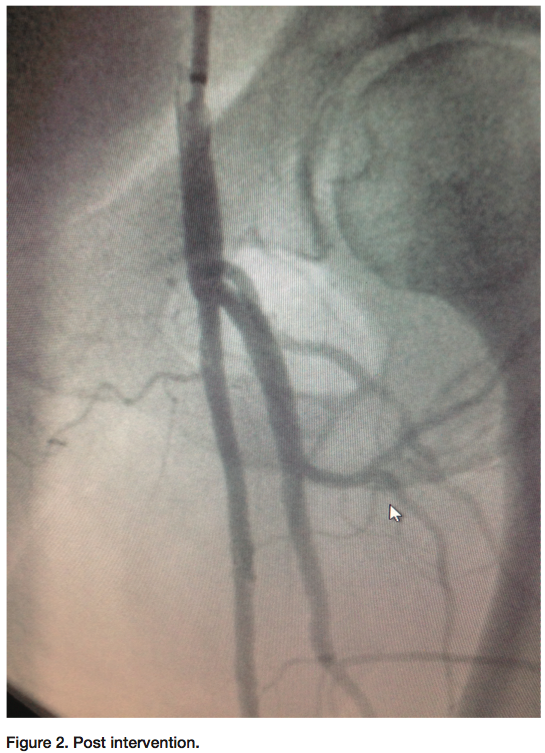 There are multiple access points that can be used for interventional access. If trying to cross an ostial iliac lesion, another access point is through the arm. Occasionally, if there is an ostial lesion of the iliac artery, using a crossover catheter (Cordis) might not supply enough support. If accessed from the arm, a long sheath can be placed closer to the lesion for more support.