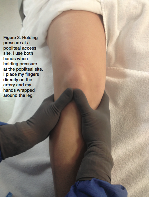 Once your intervention is finished, you will have two access points to close. If your femoral access point is suitable for a closure device, it is always a good way to close the artery. However, since these patients have peripheral disease, that area might not be suitable. If you used an access device such as Axera 2 (Arstasis, Inc.) in the beginning of the case, then waiting the appropriate time for the anticoagulation therapy before pulling the sheath is an acceptable choice. For your distal access point (such as pedal access), holding correct pressure is key. If the access was at the popliteal area, holding pressure must be with accurate precision. The technique for holding pressure at the popliteal site is up to the physician and the individual holding pressure. I use both hands when holding pressure at the popliteal site. I place my fingers directly on the artery and my hands wrapped around the leg (Figure 3). There are other acceptable ways of applying pressure as well. It depends on your facility and physician. Since holding at the popliteal site is different than holding pressure at other areas, you want to watch the area closely to ensure there is no bleeding behind the knee area. If bleeding occurs, there are a few options to stop it, including placing a covered stent at the access point to avoid surgery.