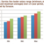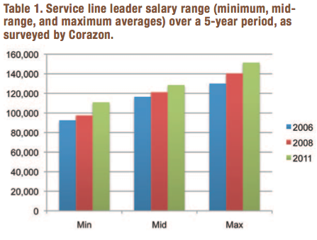 With reporting issues aside, the primary focus of this survey was to gain a better understanding of the rate providers were paying key service line leaders to work their organization. When reviewing the responses, cardiovascular service line leaders in programs with cardiac surgery capabilities had an average minimum salary of $119,973, an average mid-point salary of $141,915, and an average maximum salary of $163,428 (annually). For those working in a program without cardiac surgery capabilities but with interventional capabilities, their role had a range with an average minimum salary of $87,188, an average mid-point salary of $107,243, and an average maximum salary of $120,875 (annually). When blending the average salary ranges, and comparing them to similar surveys conducted by Corazon in 2006 and 2008, we found that the average minimum and maximum salaries have increased by 19.9% and 16.5% over the past five years, respectively. Table 1 demonstrates this upward trend.