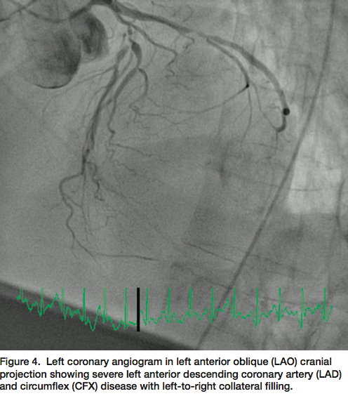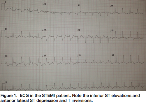 The ST-elevation myocardial infarction (STEMI) team was called in to the hospital for activation at 11:30pm on a Thursday night. I always try to get the electrocardiogram (ECG) sent to my smartphone while getting dressed and before driving in. The ECG showed acute inferior STEMI with anterior T-wave inversions (Figure 1). The ECG was not classic, but certainly was an inferior STEMI, obtained with the patient having “chest pain”. The cath lab team and I were en route to the emergency room (ER) when my fellow, Dr. Megha Agarwal, called me and said there might be some issues with consent. In the ER, I met the patient, a 60-year-old woman with a terminal illness, two weeks of atypical chest pain and shortness of breath. The chest pain was now associated with more severe shortness of breath which had been increasing over the last one week.