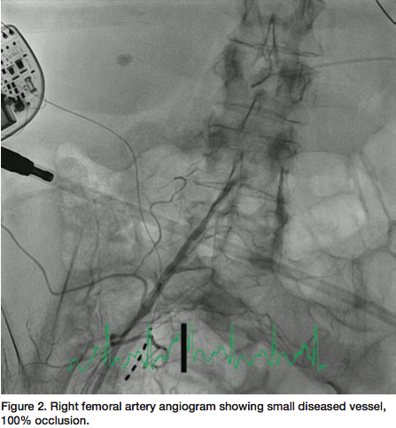 Little did I anticipate that this patient would have the worst peripheral vascular and coronary artery disease I had seen in ten years. The procedure began from the femoral approach since she had bilateral wrist contractures and no pulses. Ultrasound-guided femoral artery access was used since there were no palpable femoral pulses. After an hour of attempts for access, we found that the right iliac artery was 100% occluded and the left femoral and iliac arteries were diffusely diseased, with serial 90% lesions to the aortic junction (Figures 2-3). We were able to pass 5 French catheters to the coronary ostia and found that both the left and right