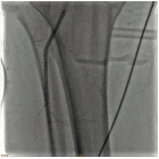 As previously planned, the patient returned two weeks after treatment of the right leg for treatment of his left leg. This procedure was markedly similar in both disease pattern and intervention to the previous one. Baseline angiography of the left leg also revealed patent iliac, common femoral and profunda arteries, moderate inflow disease of the SFA, and significant disease in the AT, TPT, and PT arteries (Figure 6):
