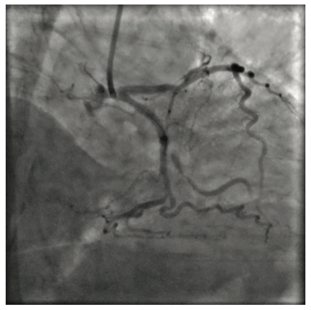 A 73-year-old female presented to the cardiac catheterization laboratory with chest pain, a half-millimeter ST-segment depression in inferior leads, and rising troponin over the previous 14 hours. Angiography revealed a completely occluded large first obtuse marginal artery (OM1) with an acute angle take-off from a dominant circumflex coronary artery.
