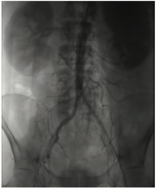 a. Access was through the left femoral artery. The common iliac into the aorta was significantly stenosed (>70%)