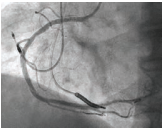 A 6 Fr, 10 cm GLIDESHEATH SLENDER® Introducer Sheath (Terumo) was used to gain access in the right radial and left distal radial arteries. Two hundred (200) mcg of intra-arterial nitroglycerin and 200 mcg of intra-arterial nicardipine were given for each access. Each access point was exchanged for a 6 Fr, 85 cm R2P DESTINATION SLENDER Guiding Sheath (Terumo) over a 180 cm, .035-inch J-tipped guidewire. A 6 Fr Amplatz Left (AL) 0.75 VISTA BRITE Guiding Catheter (Cordis) was used to engage the right coronary artery and a 6 French XB 3.5 ADROIT™ Guiding Catheter (Cordis) was used to engage the left coronary artery. A Twin-Pass® Dual Access microcatheter (Teleflex) was advanced over the RUNTHROUGH® NS Coronary Guidewires (Terumo) into the proximal right coronary artery. A Fielder® XT-A (Asahi Intecc) was then used in an attempt to engage the proximal cap, but was without success. It was exchanged for a MIRACLEBROS® 6 (Asahi Intecc), which penetrated the proximal cap, but was unsuccessful at crossing the distal cap. The Twin-Pass Dual Access microcatheter was exchanged for a Turnpike® LP microcatheter (Teleflex) but was also without success. The Turnpike was then exchanged for a Fielder XT-A, then a HI-TORQUE PILOT™ 200 guidewire (Abbott Vascular), and finally, a CONFIANZA® Pro 12 guidewire (Asahi Intecc), all of which were unable to cross the distal cap true-to-true lumen. Instead, a HI-TORQUE PILOT 200 guidewire was knuckled, and used to perform subintimal tracking and re-entry technique into the mid right coronary artery. The HI-TORQUE PILOT 200 guidewire was first exchanged for a RUNTHROUGH NS Extra Floppy guidewire to wire the RV marginal branch and then exchanged for a GRAND SLAM® guidewire (Asahi Intecc). A 2.5 mm x 20 mm EMERGE PTCA Dilation Catheter (Boston Scientific) was used to pre dilate the lesion, followed by a 3.0 mm x 20 mm NC EMERGE PTCA Dilation Catheter (Boston Scientific). Angiography showed antegrade flow into the RV marginal, but not into the posterior descending artery or the posterolateral branches. Two SYNERGY EES PtCr coronary stents (Boston Scientific), a 3.5 mm x 38 mm and a 3.5 mm x 12 mm, were deployed proximally. A RUNTHROUGH NS Extra Floppy coronary guidewire with a Turnpike LP was then used to wire the posterior descending artery/posterolateral branches and the RUNTHROUGH NS Extra Floppy coronary guidewire was exchanged for a GRAND SLAM guidewire. The Turnpike LP was removed using a DOC Guide Wire Extension (Abbott Vascular). A 2.75 mm x 38 mm SYNERGY EES PtCr coronary stent was deployed from the posterolateral into the distal right coronary artery, followed by a 3.5 mm x 38 mm SYNERGY EES PtCr coronary stent. All stents were deployed at nominal pressure. The first GRAND SLAM coronary guidewire was removed. A 3.5 mm x 20 mm SYNERGY EES PtCr coronary stent was then deployed, overlapping the first and second 3.5 mm x 38 mm stents. These stents were then post dilated with a 4.0 mm x 20 mm NC EMERGE PTCA Dilation Catheter. A 3.5 mm x 12 mm SYNERGY EES PtCr coronary stent was deployed at the ostium of the right coronary artery and post dilated with a 4.0 mm x 20 mm NC EMERGE PTCA Dilation Catheter. Final angiography showed TIMI-III flow, no residual stenosis, and no perforation or dissection.