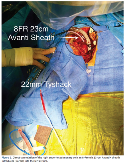 Bioprosthetic mitral valve replacement is a common surgical procedure for patients with mitral valve disease. However, bioprosthetic valves are associated with the risk of early valve dysfunction, which can lead to significant morbidity and mortality.1 Cardiogenic shock is a serious complication that can occur after cardiac surgery and requires urgent intervention, including venoarterial extracorporeal (VA ECMO) support. The effect of VA ECMO on bioprosthetic valve function is not well understood, and there is limited data on the optimal management of early valve dysfunction in this population. Several cases have been reported of bioprosthetic mitral valve stenosis during VA ECMO life support successfully treated using percutaneous balloon valvuloplasty.2 However, there are no cases in the literature demonstrating direct pulmonary vein cannulation with an open chest.