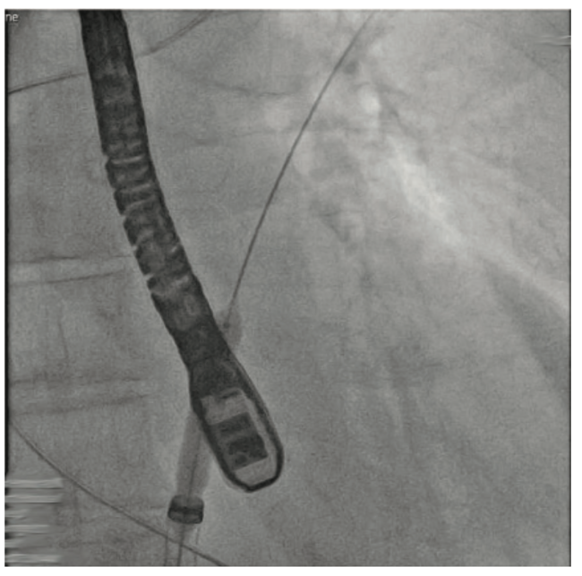 Crossing the interatrial septum was challenging. Although we were able to cross the interatrial septum with a transseptal needle, advancing the sheath across the fossa ovalis was difficult. Several maneuvers such as rotating and redirecting the sheath were not successful. Pre-dilation of the septum with 5 mm x 40 mm balloon did not allow for insertion of the MitraClip guide across the interatrial septum. At this point, we elected to use the balloon-assisted tracking (BAT) technique. Using a 7 mm x 40 mm balloon that was inflated to 10 atmospheres (atm) at the tip of the guiding catheter, we were able to advance the sheath through interatrial septum (Figures/Videos 1-3). Subsequently, a G4 XTW MitraClip was successfully deployed in the central position. A post procedure transesophageal echocardiogram showed mild mitral regurgitation.