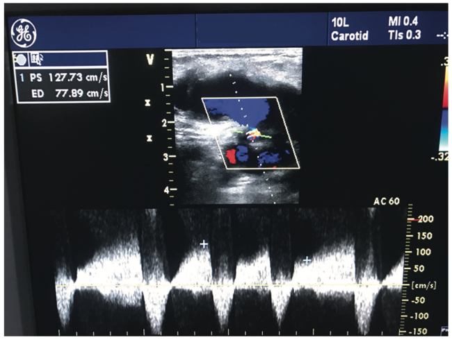 A 52-year-old hypertensive male with ongoing tobacco use presented to our outpatient clinic for regular follow-up, one and a half months after percutaneous coronary intervention via a femoral route. On inquiry, the patient complained of a swelling in the right groin. A local examination showed a pulsatile non-tender mass with normal temperature and appearance of overlying skin. There was an audible bruit with no palpable thrill. The distal limb was normal, including intact neurovascular bundle. We investigated using routine blood tests and Doppler ultrasound of affected side, which showed a large (38 mm x 45 mm), oval-shaped, blood-filled aneurysmal cavity superficial to the common femoral artery (CFA) (Figure 1). The cavity had a thin wall lined by connective tissue and linear hematoma, and was communicating with the CFA through a narrow neck (4.5 mm), all consistent with the formation of a femoral pseudoaneurysm. To confirm this diagnosis, a color Doppler at the neck was performed and showed the typical interplay of red and blue, traditionally labeled as the ‘ying-yang’ sign (Figure 2) or ‘Pepsi-Cola’ sign. Furthermore, the pulsed-wave Doppler exhibited a ‘to-and-fro’ pattern of blood flow via the neck (Figure 3). The patient was then evaluated by the interventionist and the vascular surgeon to determine how to best manage this iatrogenic complication. Options included ultrasound-guided compression, vascular surgery, and ultrasound-guided thrombin injection. The last option was selected as the appropriate first technique for treatment in this case.