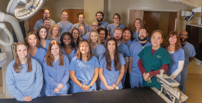 Terra Jarrell RN, RCIS; Adrienne Lozito; Emily Chatman RN; Brandy Wynn RN; Daniel Hastings RT; Michael Martin RT; Sheila Wood RN; Michael Mitchell; Viktoria Castanos RN; Brooke Loggins RT; Joi Buckley RN; Amber Smith RT; Henry Chen MD. Photograph by Danielle Treece and James Stovall.