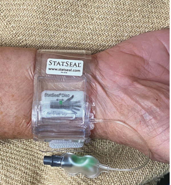 Arnold H. Seto, MD, MPA: This trial was an unsponsored, investigator-initiated study to follow up on an earlier pilot study testing StatSeal® (Biolife, LLC), a potassium ferrate hemostatic patch (Figure 1), as an adjunct to compression with the TR Band® (Terumo) for transradial catheterization.1,2