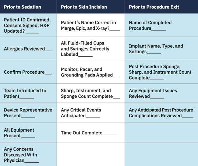 Abstract. Procedural checklists are used in a wide variety of industries, ranging from aviation to healthcare. The goal of a checklist is to reduce variability in practice with the goal of improving patient safety and outcomes. In healthcare, improving the reliability of treatment processes or interventions by reducing variability in how interventions are delivered has been shown to improve patient morbidity and mortality outcomes. To improve reliability of processes in a hospital-based cardiovascular lab, the World Health Organizations Safe Surgery Checklist was implemented.