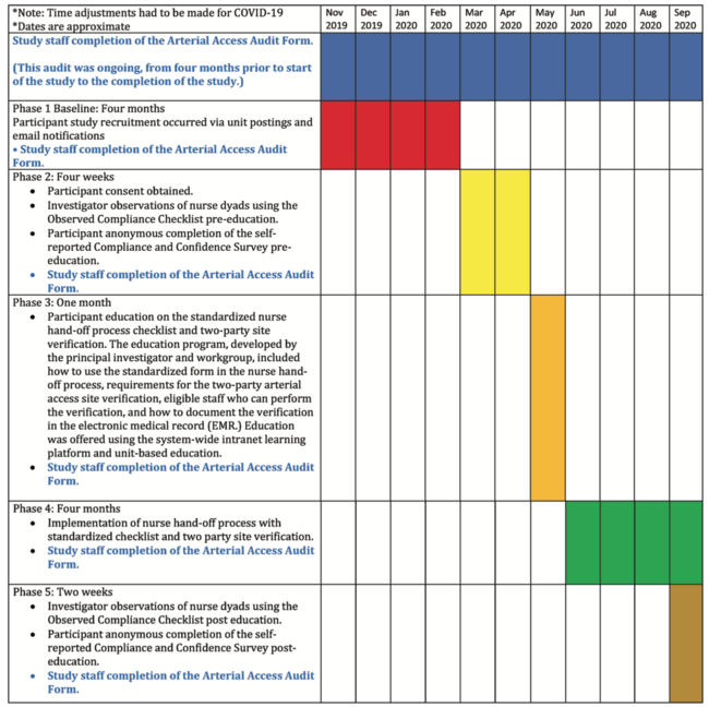 Objective: To measure changes in nurses’ self-reported compliance and confidence, observed compliance, and number of communication-related negative patient outcomes before and after the implementation of a standardized report form and two-party verification of the arterial access site during nurse hand-off.