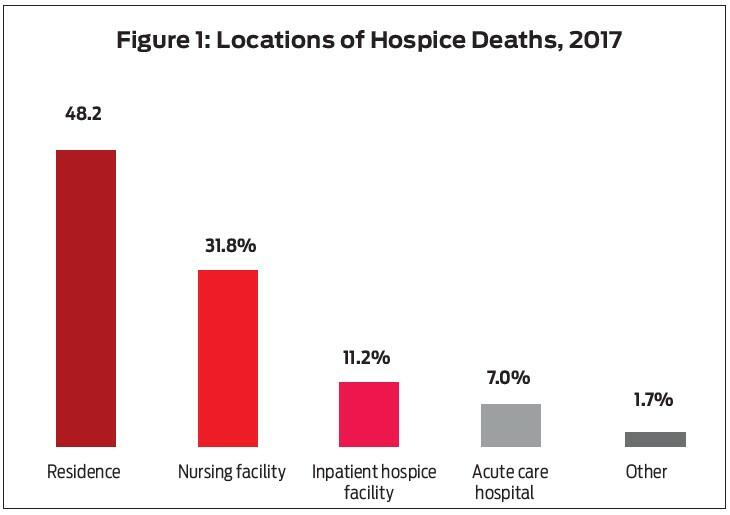 Hospice care is a collaboration between healthcare providers, support staff, patients, and patients’ caregivers. This team approach provides patients with services like personal hygiene, medications, counseling, pastoral care, and other therapies. While most hospice patients die in their homes (Figure 1),5 hospice services can be provided in other settings, such as hospitals, nursing homes, and nontraditional locations like prisons.15