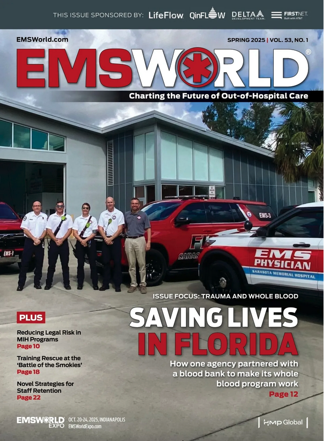 Our Spring 2025 issue includes a special focus on trauma and whole blood programs; columns on ketamine and liability in MIH programs; feature stories on technical rescue and emotional pressure in EMS; and more!