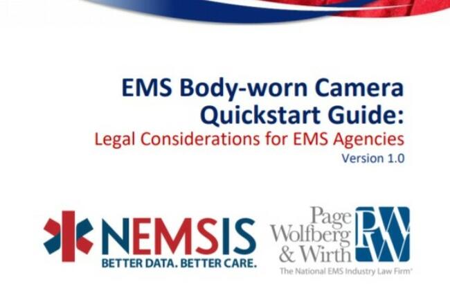 Although body-worn cameras aren’t yet widely used in EMS, interest is growing, and organizations that have employed them have seen significant benefits—and some limitations. To help guide agencies, the National Emergency Medical Services Information System Technical Assistance Center (NEMSIS TAC), in cooperation with the EMS law firm Page, Wolfberg, & Wirth, has released the EMS Body-Worn Camera Quickstart Guide: Legal Considerations for EMS Agencies. The guide provides an overview of general legal issues for EMS agencies thinking about using body-worn cameras.