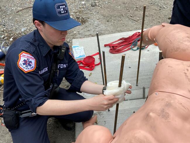 Scene setup: Simulated patient (manikin) impaled on multiple pieces of rebar in concrete.
