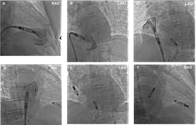 3. Delivery system orientation to optimize tricuspid valve crossing and septal positioning. Crossing into the RV can be difficult, but the following tips can successfully navigate a difficult tricuspid valve crossing. With RV implants, device position is visually assessed on fluoroscopy to be just above the superior vena cava and right atrial junction. Then, we begin deflecting across the tricuspid valve with counterclockwise rotation of the delivery sheath to cross anteriorly through the valve. Advancing the outer sheath over the delivery system can also help provide support when attempting to cross the valve. There are rare instances that a higher approach is warranted but could be used; be extremely cautious to prevent the sheath from popping across the tricuspid valve in a superior-to-inferior trajectory. It is also important to use the left anterior oblique (LAO) view to aid in coaxial trajectory across the valve. Once across the tricuspid valve, remove all deflection and allow the delivery system to be directed towards the right ventricular outflow tract (RVOT), as this is an anatomically septal structure. We believe starting in this location allows for less entrapment in the tricuspid valve apparatus, which may hinder septal trajectory with clockwise rotation. Slight deflection from the RVOT with initial clockwise rotation should position the device in septal orientation, but should be confirmed in the LAO view. Individualize LAO orientation for each patient, as this is not always reproducible and is dependent on heart rotation. Furthermore, delivery sheath orientation can best be visualized in the LAO view, as the deflected portion of the sheath will appear foreshortened across the tricuspid valve, with the tip of the sheath oriented in the mid RV cavity. In this position, a quick fluoroscopic assessment will provide spatial reference of the septal aspect of the tricuspid valve (TV), which could sometimes act as a negative fulcrum point to prevent septal position with continued clockwise rotation, orientating the sheath parallel to the septum with the tip of the delivery system directed to the anterior wall in the LAO view. If this occurs, 2 techniques can be performed: (1) counterclockwise rotation of the whole system to remove the fulcrum point off the septal aspect of the tricuspid valve annulus, which may direct the tip of the sheath septal; or (2) counterclockwise rotation to neutral position, slightly pulling back on the delivery system and reapproaching septal orientation with clockwise rotation. In our experience, the LAO 40-degree view should individualize septal position for most patients.