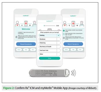 ICMs have been commercially available for many years, so in some ways, the ICM is not a new concept. The candidate patient population is fairly broad, and includes patients with suspected arrhythmias or those at risk of developing arrhythmias. ICMs are used for conditions such as unexplained syncope, palpitations, atrial fibrillation, and cryptogenic stroke. Technological advances have enabled industry to develop smaller forms of these implantable monitors and use available communication schemes to change the landscape of ICM use. The miniaturization of the devices, along with the ability to rapidly and remotely obtain patient data, has been a revolution. We are now at a point in time where devices are tiny, the implant procedures take minutes and can be done in the outpatient/office setting, and data can be transmitted using Bluetooth/Wi-Fi. An app (myMerlin™ mobile app, Abbott) on a patient’s smartphone or handheld device is available for both iOS and Android devices for use with the ICM. There is little doubt that these features, along with the future incorporation of other biologic sensors, are increasing the adoption and use of these technologies in medicine.