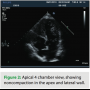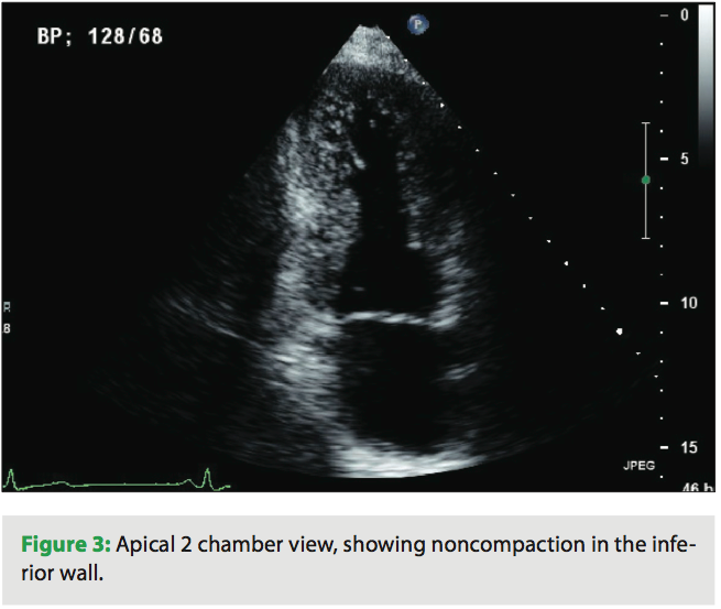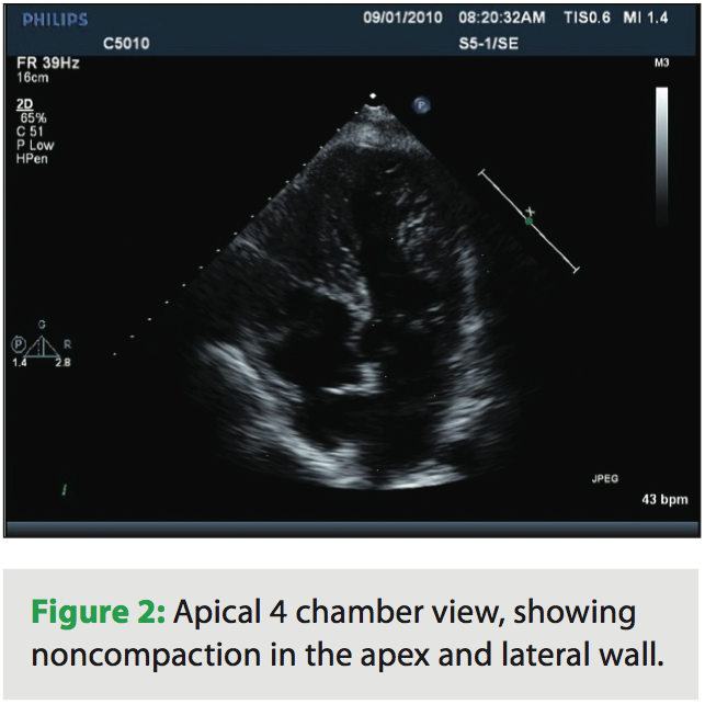 A 39-year-old female presented to the emergency department with chest pain and palpitations. She was hiking with her husband when the palpitations started and she felt her pulse, which seemed to be fast and irregular. Her pain was in the center chest, sharp with no radiation, but she felt fatigued and tired. She reports a history of being short of breath in the past two months during exercise. Her father died suddenly at age 30 years, but never had an autopsy done. She takes no medications and works as a nurse. Her physical examination revealed a heart rate of 160 beats per minute and her blood pressure was 110/65. Her pulse was irregular, and her ECG revealed atrial fibrillation with left ventricular (LV) hypertrophy. Her labs were normal, and her troponin level was 0.29 ng/mL. An echocardiogram was done and revealed increased LV wall thickness, and she was diagnosed with hypertrophic cardiomyopathy. Her ejection fraction was noted to be 40% with wall motion abnormalities. She was transferred to our center, and by the time she arrived, she was in sinus rhythm. She underwent left heart catheterization, which showed normal coronary arteries. When reviewing her echocardiogram, heavy trabeculations were noted in the apex, inferior wall, as well as the lateral wall (Figures 1–3). She was diagnosed with noncompaction of the left ventricle, with a ratio of noncompacted to compacted myocardium of 2.5/1. She had no other congenital heart defects except for patent foramen ovale.