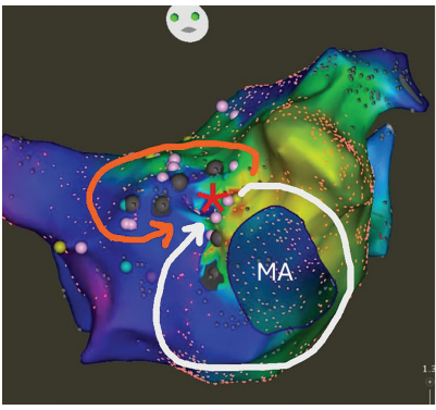 In Figure 2, complex clockwise activation is seen around the MA plus septal scar in a patient with severe septal scarring. The right PVs served as the posterior boundary, which excluded the roof or lateral mitral isthmus as critical, and led to successful ablation of a small septal channel that was critical to this flutter.