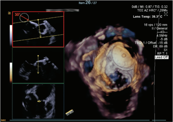 Due to the complexity of the transseptal puncture, the decision was made to have 2 operators perform the case. To ensure the most accurate visualization of the ASD occluder and the target puncture site, 4-dimensional TEE was utilized as a guide.